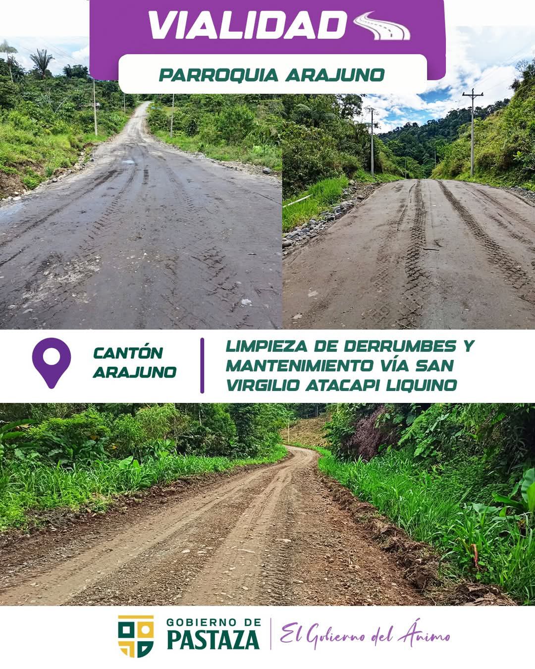 En la vía San Virgilio – Atacapi – Liquino, realizamos el mantenimiento vial en una longitud de 2 kilómetros.
