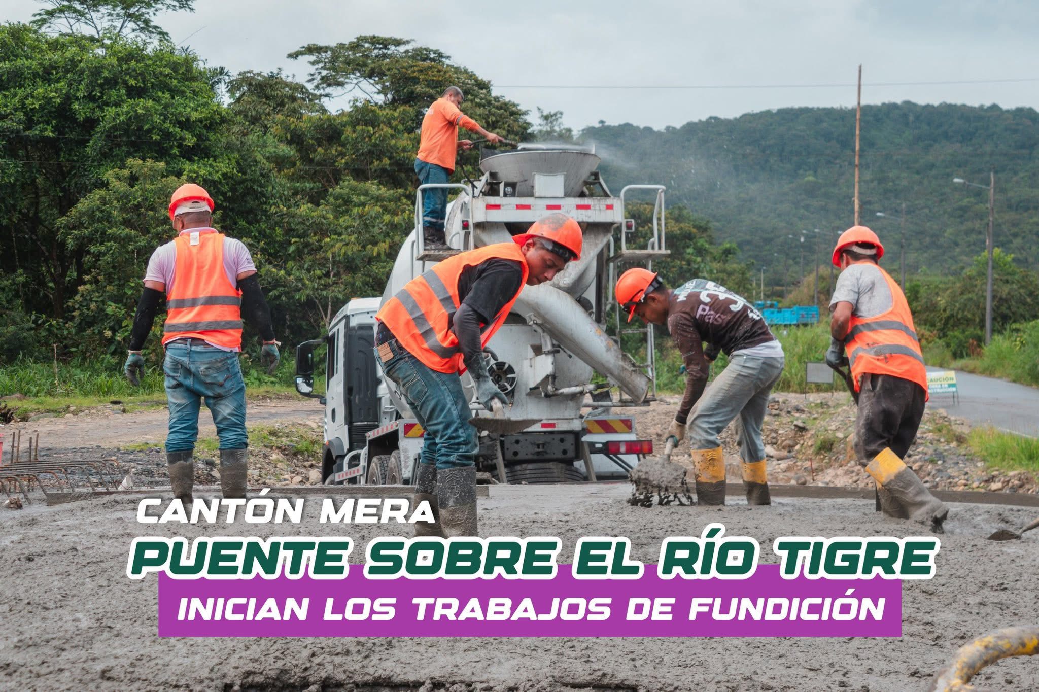 Continúa el trabajo de fundición de hormigón en el puente sobre el río Tigre, en Mera, bajo la gestión de la Prefectura de Pastaza y el liderazgo de André Granda.