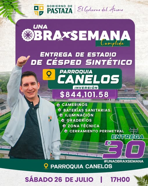 DE PRIMERA y desde la ruralidad, brillamos con fuerza. El nuevo estadio en la histórica parroquia Canelos ya es una realidad. Un espacio digno, moderno y con alma comunitaria. Importante