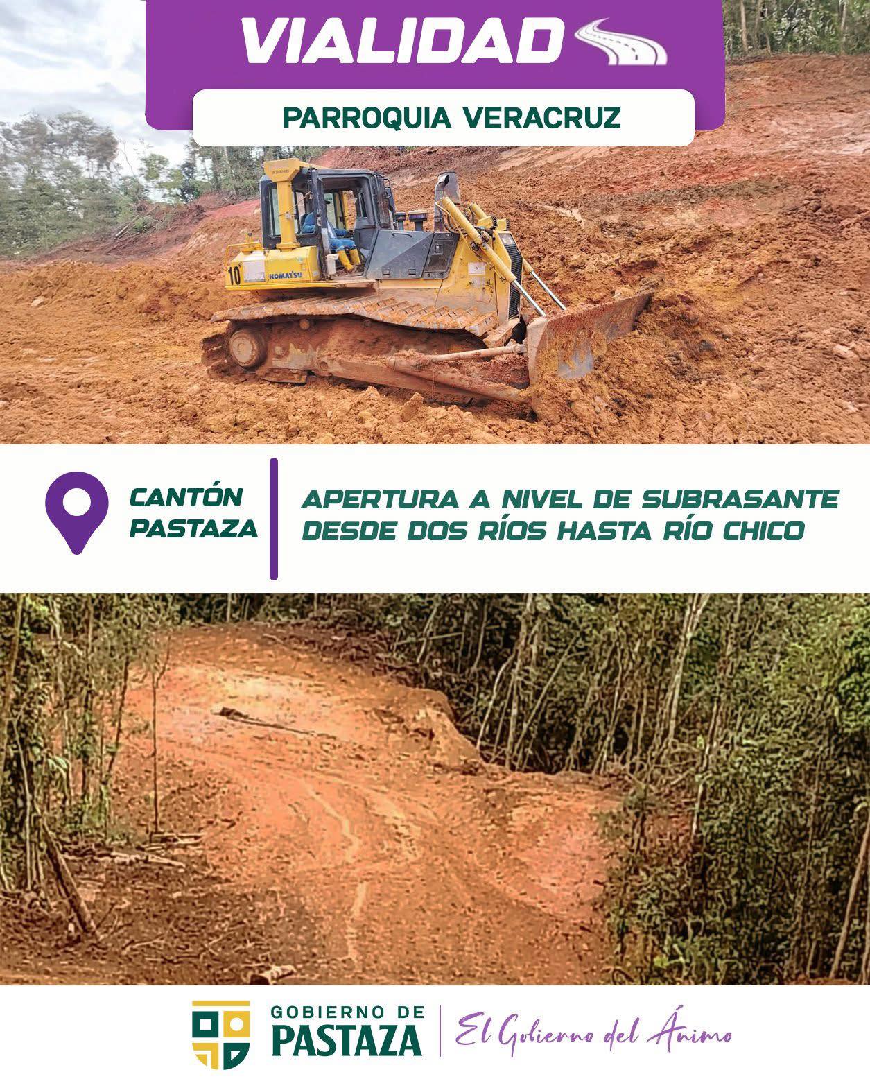 El Gobierno de Pastaza, bajo la administración del prefecto André Granda, impulsa el proyecto de Apertura a Nivel de Subrasante desde Dos Ríos hasta Río Chico, en la parroquia Tarqui.