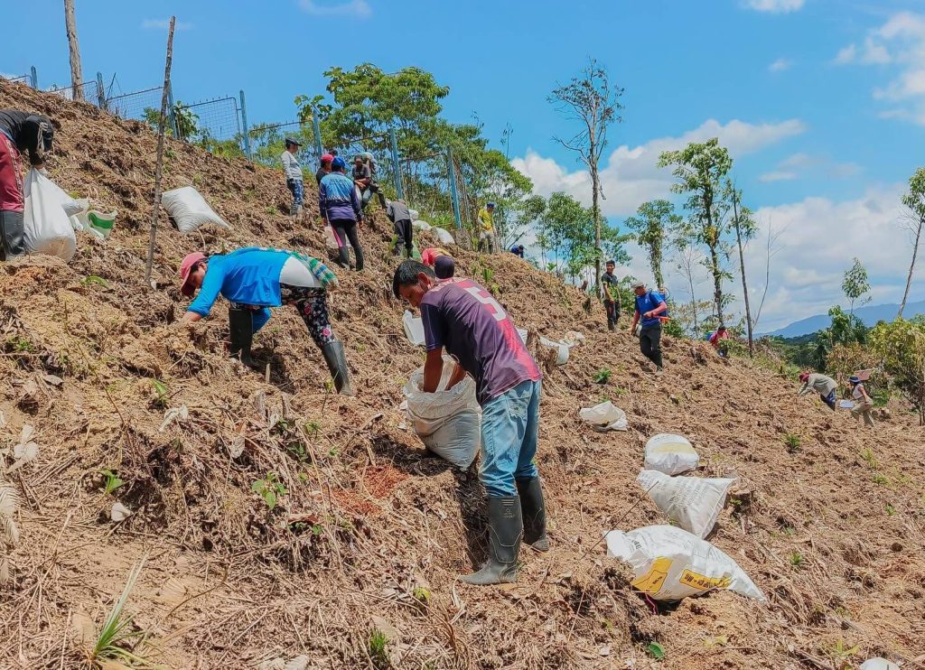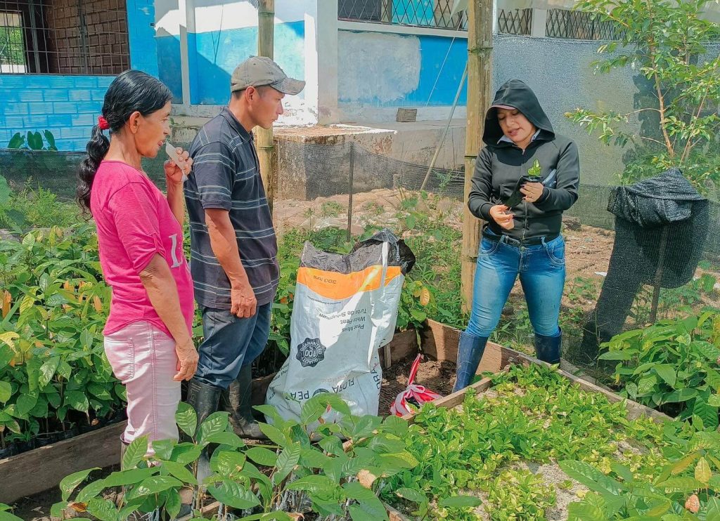Durante la jornada se entregó una bomba de fumigar, se aplicó biofertilizante del Biocentro de Fátima en los cultivos de papa china, café y cacao, y se realizó el trasplante y enfundado de plántulas de café.