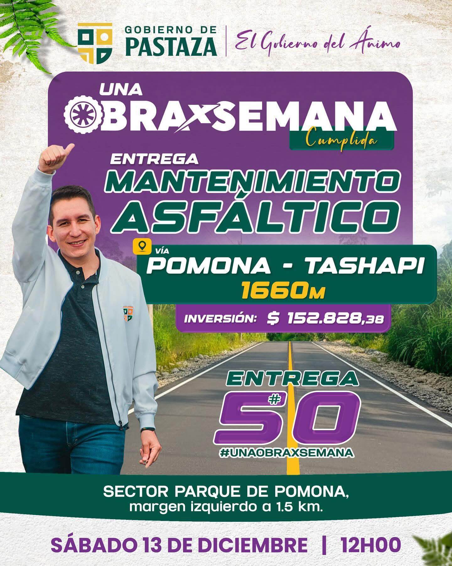 Pastaza se lo merece !!! #UnaObraXSemana cumple su entrega 50 y ya un año de gestión permanente ! No nos detenemos !!!#ElGobiernoDelAnimo